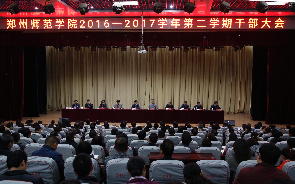 赵健书记就抓好新学期各项工作落实,向全体干部提出三点要求。一是要充分认清当前形势,准确把握发展大势,全力凝聚发展共识。高等教育肩负着为经济社会发展提供强有力的人才和智力支持的重大使命,“十三五”时期,全面建成小康社会的奋斗目标为高等教育履行自身历史使命带来新的机遇。从我们学校自身来看,学校十三五规划也已于春节前由郑州市政府常务会议审议通过,这是学校党委制定的“三步走”战略的延续和拓展。全校上下务必要统一思想、提高认识,振奋精神、坚定信心,按照“教师教育做精做强,非师专业做实做优”的发展思路,紧紧围绕“一个目标”,大力实施“两个推进”,积极深化“三项改革”,努力实现“四个突破”,加快推进高水平本科院校建设步伐。二是要全面依法从严管党治党,牢牢把握意识形态主动权,为发展提供坚强思想政治保证。党的建设和思想政治工作是学校改革发展的根本政治保障和组织保障。按照中央全面从严治党的要求,联系学校实际,弛而不息地抓作风建设,学校领导班子要做好表率,中层干部要带好头,每一位党政干部都要严守政治纪律、认真履职尽责、服务学校大局。要认真贯彻落实《关于进一步加强和改进新形势下高校宣传思想工作的意见》,强化责任意识、坚持正面引导、化解负面干扰,紧紧抓住意识形态工作不放松,让社会主义核心价值观渗透在校园文化之中,成为师生员工的自觉操守。抓好省委巡视意见整改落实工作,认真落实党风廉政建设党委主体责任、纪委监督责任,强化作风督查。强化基层党组织政治功能,切实发挥基层党组织的政治核心、战斗堡垒以及党员的先锋模范作用,为全面深化综合改革和依法治校提供有力的组织保障。三是要牢固树立责任意识,自觉强化担当精神,全面激发内在动力。要全面推行重点项目、重点工程、重点工作分管领导负责制和责任包干制,把目标任务层层分解,落实到具体单位和具体责任人员,对每一项工作都要定人员、定责任、定时间、定进度,确保事有专管之人,人有明确之责,时有确定之期。要建立健全事前、事中、事后全程跟踪的督查机制,提出改进措施,指导推进工作。要建立健全科学的工作绩效考核体系和奖惩办法,坚持奖优、治庸、罚劣三位一体,从严考核标准,形成良好的工作导向。