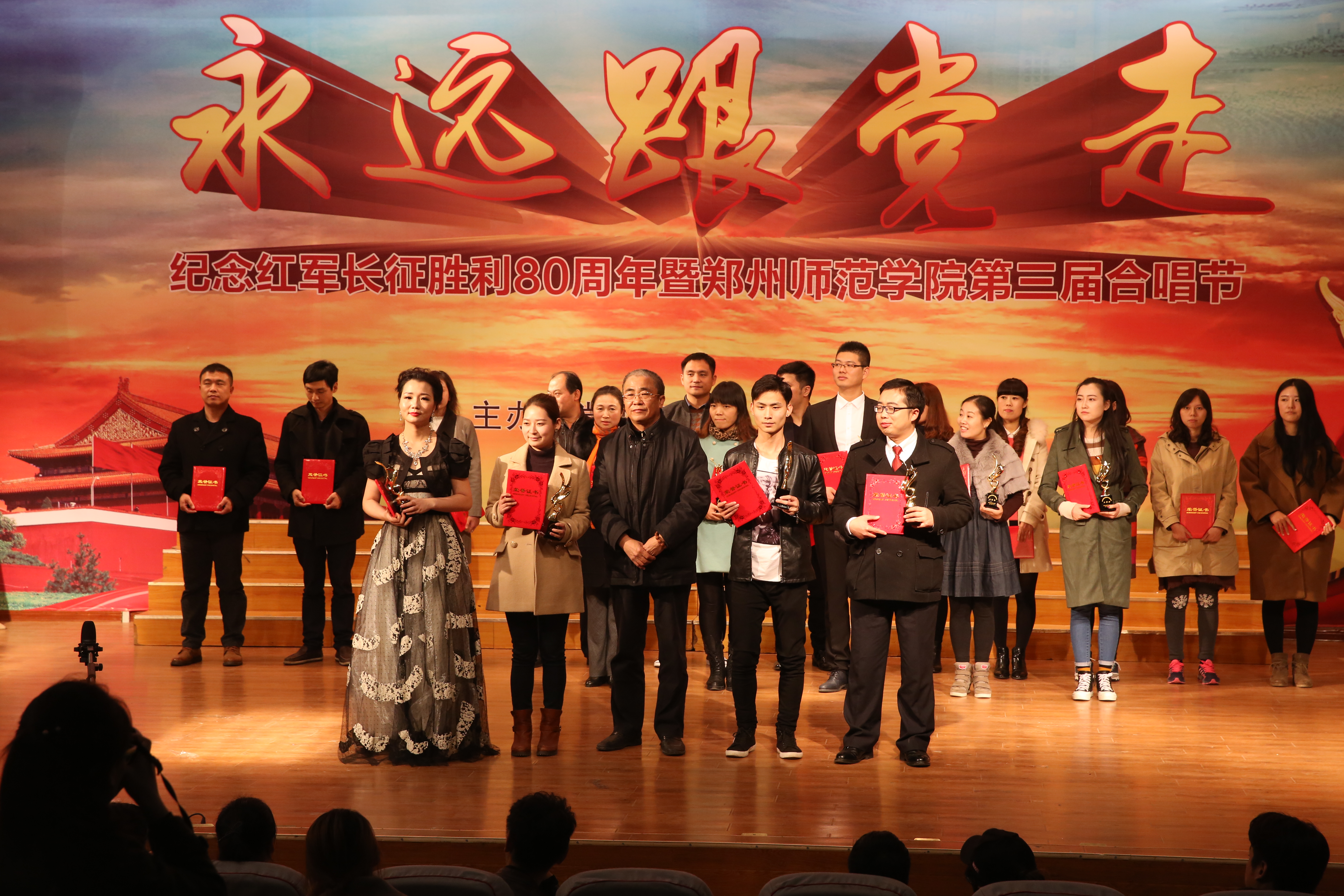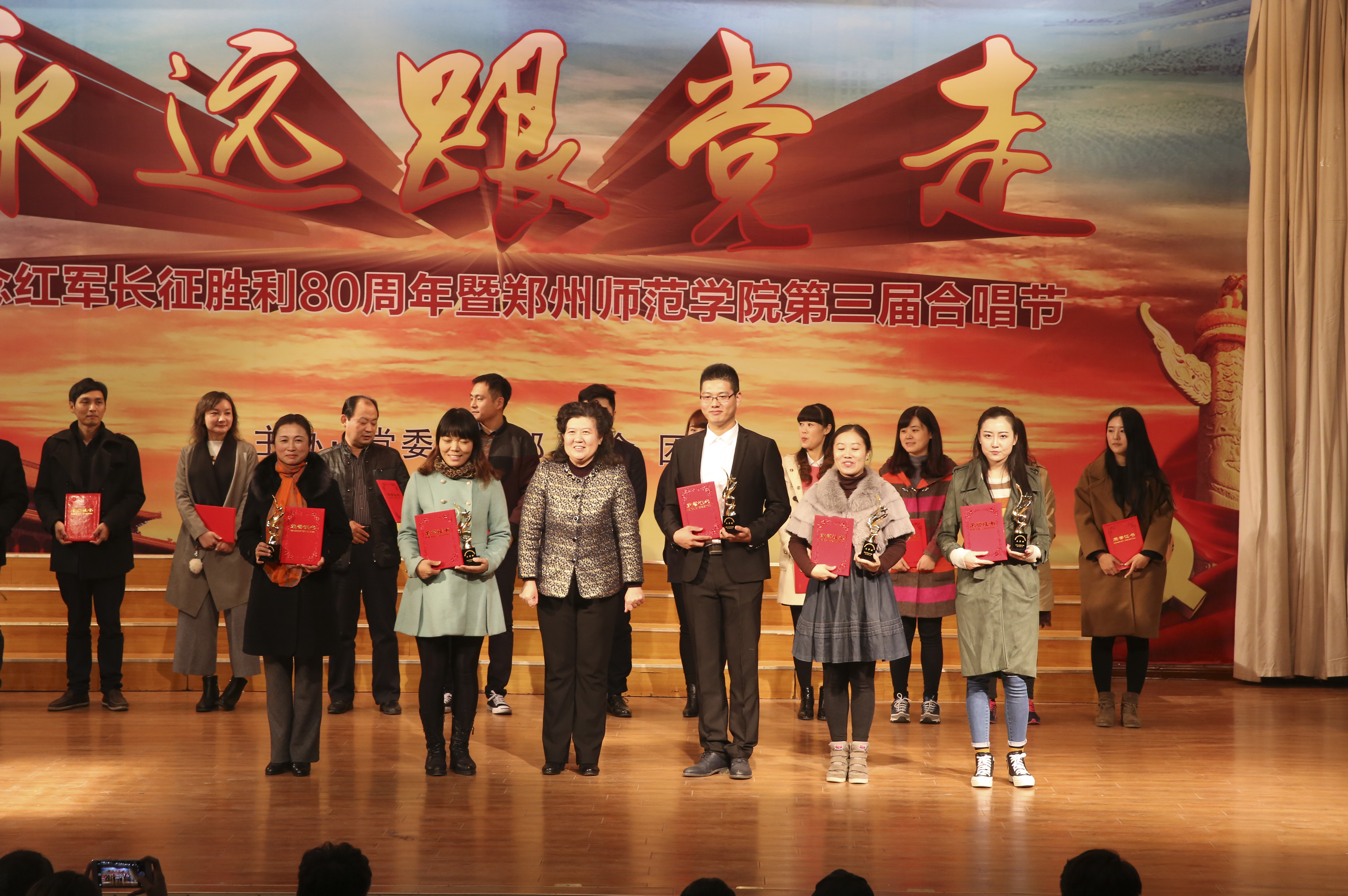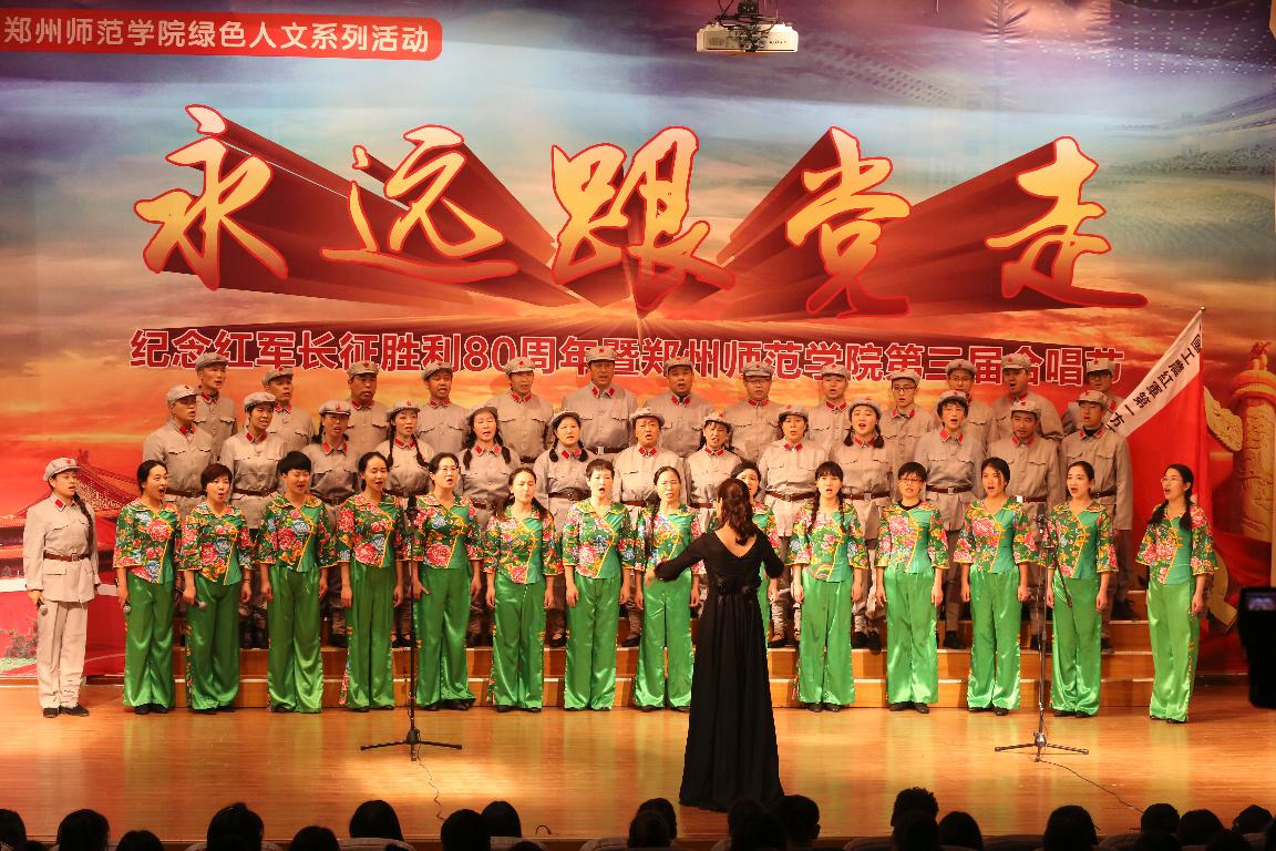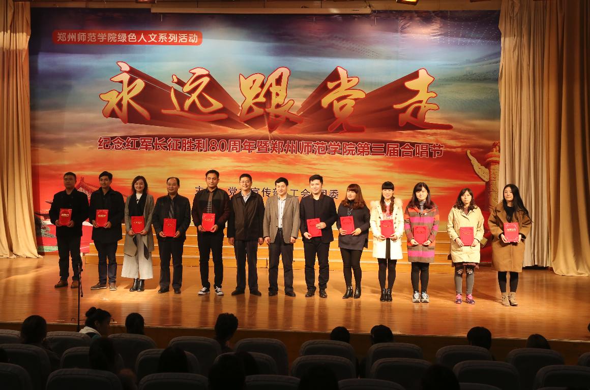 绿色人文系列活动——“永远跟党走”合唱节是我校加强思想引领,发挥校园文化育人功能,加强师生爱国主义、集体主义、荣校爱校教育的品牌活动,已连续举办三届。本届合唱节从6月份启动,历时5个多月,参与人次近3000人,活动历时长、覆盖面广、参与率高、活动效果好。全校各单位都高度重视,精心准备,利用课余间隙,组织师生学唱校歌《与中原一同崛起》和弘扬主旋律的歌曲。经过预赛初赛,共有12支代表队进入最后的决赛。经过专家评委们的认真评选,外国语学院、机关党总支获得一等奖;信息科学与技术学院、初等教育学院、信息物流学院、美术学院获得二等奖;历史文化学院、教育科学学院、特殊教育学院、图书馆、政治与公共管理学院获得三等奖,离退休工作处老干部合唱团获特别表演奖。