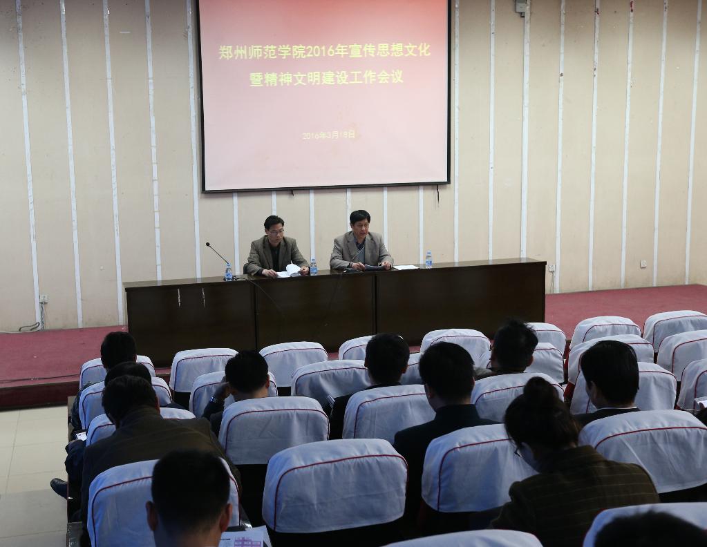 3月18日下午,我校2016年宣传思想文化暨精神文明建设工作会议在1号楼报告厅召开。校党委副书记、工会主席弓民出席会议并部署工作。各党总支书记,机关各处室负责人,各学院团总支书记、文明督导员、全体辅导员及宣传部、团委全体工作人员参加会议。会议由宣传部负责人主持。