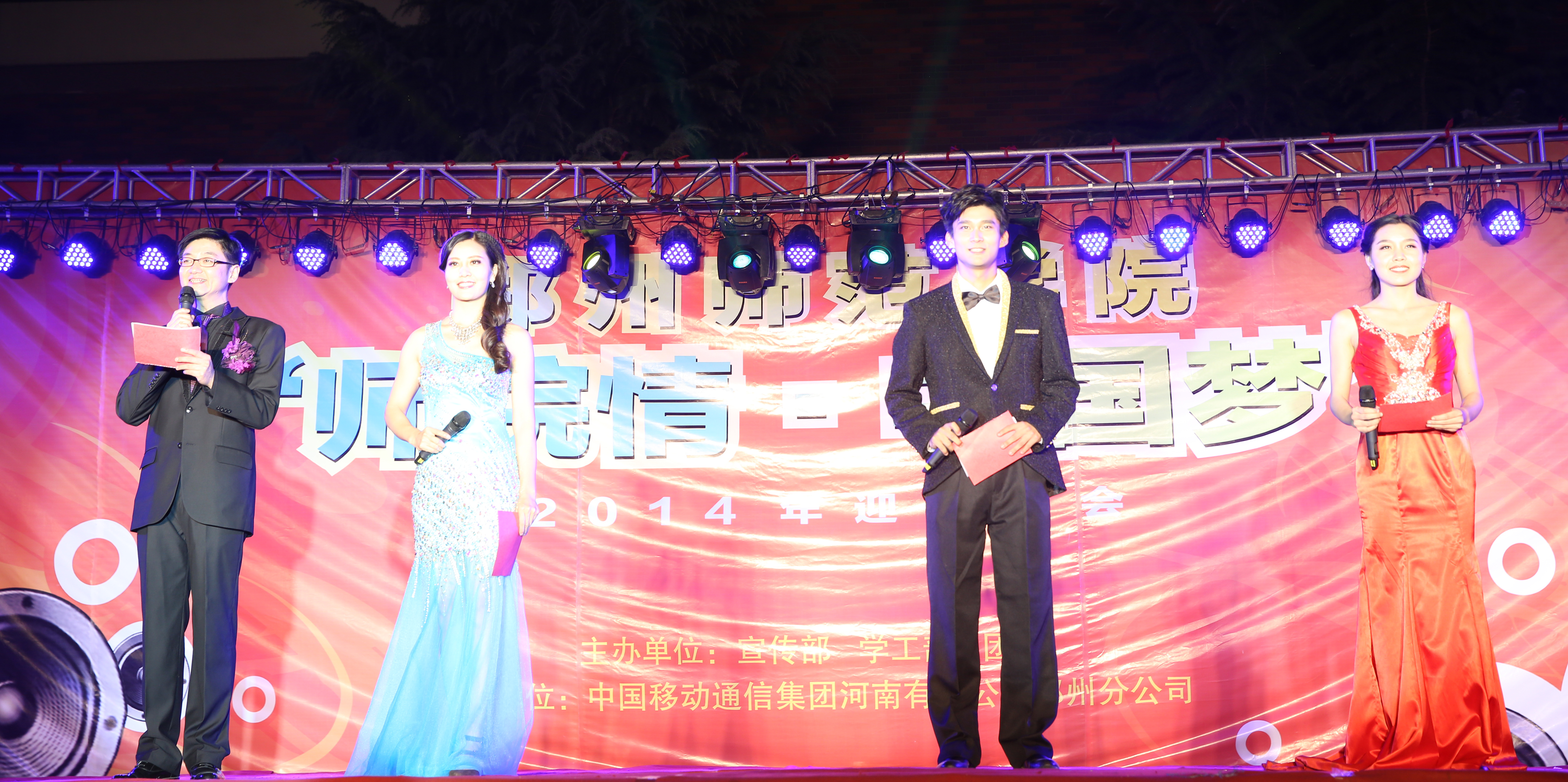 10月14日晚7点,由我校宣传部、学工部、团委主办的2014年“师院情 中国梦”迎新晚会在西校区艺术广场举行。出席此次晚会的领导有:党委书记于向英,校长赵健,党委副书记、工会主席弓民,副校长王北生,副校长张建航,副校长孔青,中科院研究员、博士生导师马润林。各行政部门负责人和各学院党总书记、院长、副书记等也到场观看晚会。近6000名师生观看了此次迎新晚会。
