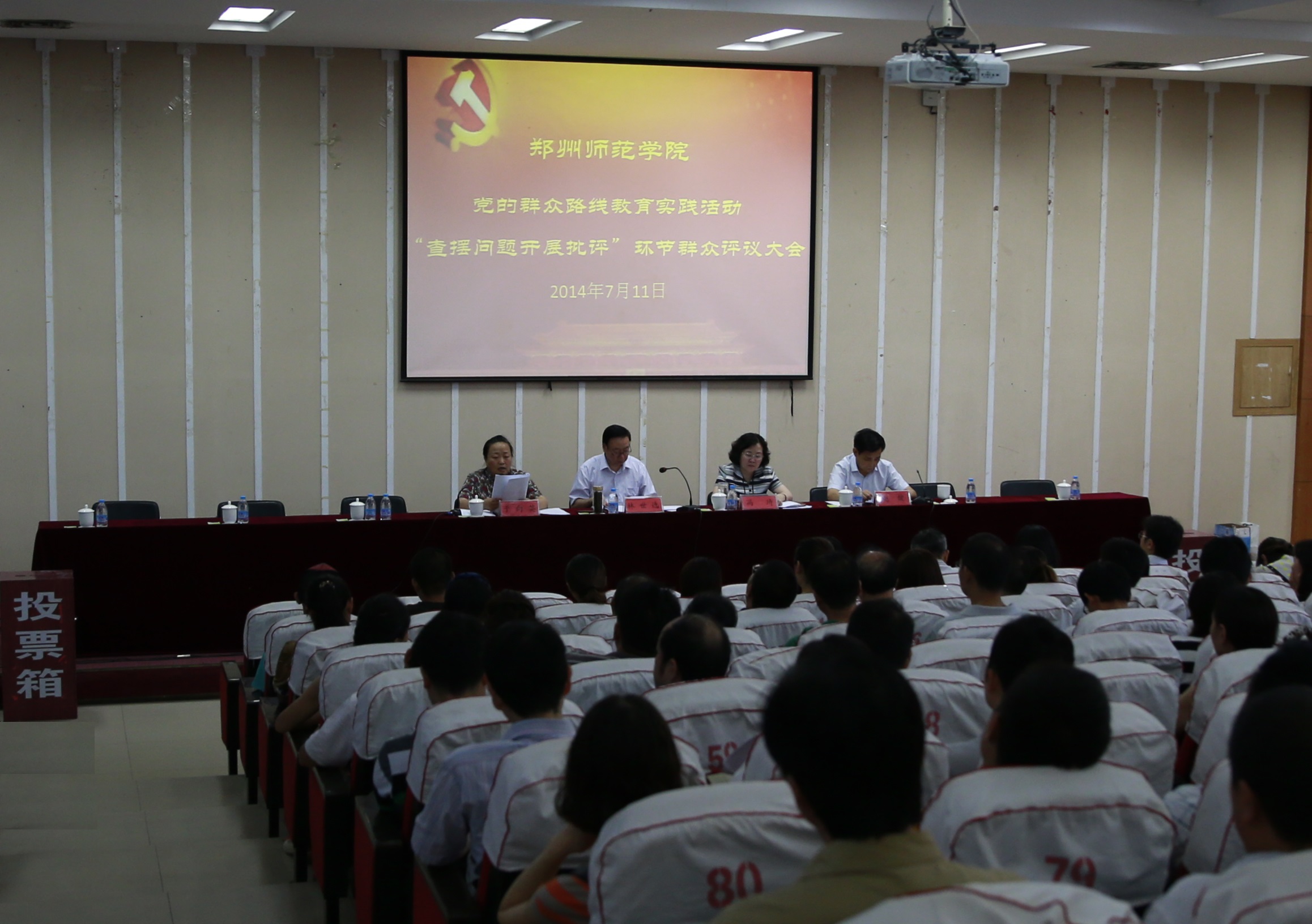 党委书记于向英同志作了《郑州师范学院教育实践活动查摆问题开展批评情况综合报告》。报告指出:党的群众路线教育实践活动开展以来,在省委活动办的正确领导和第二十督导组的精心指导下,学院按照省教育实践活动领导小组关于做好教育实践活动的各项要求,坚持领导带头、全员参与,扎实推进第二环节“找准找实突出问题、开展谈心交心、撰写对照检查材料、召开专题民主生活会、开展群众评议”等工作。对学院“四风”方面普遍存在的突出问题、师生员工反映强烈的重点问题下猛药、用重拳、出硬招,一项一项进行了治理,确保专项整治取得实实在在的成效。围绕巩固整改落实成果、促进学院科学发展,认真对现行制度进行梳理,形成科学规范的制度体系,推进学院各项工作的规范化、科学化水平,为学院发展提供有力的制度保障。