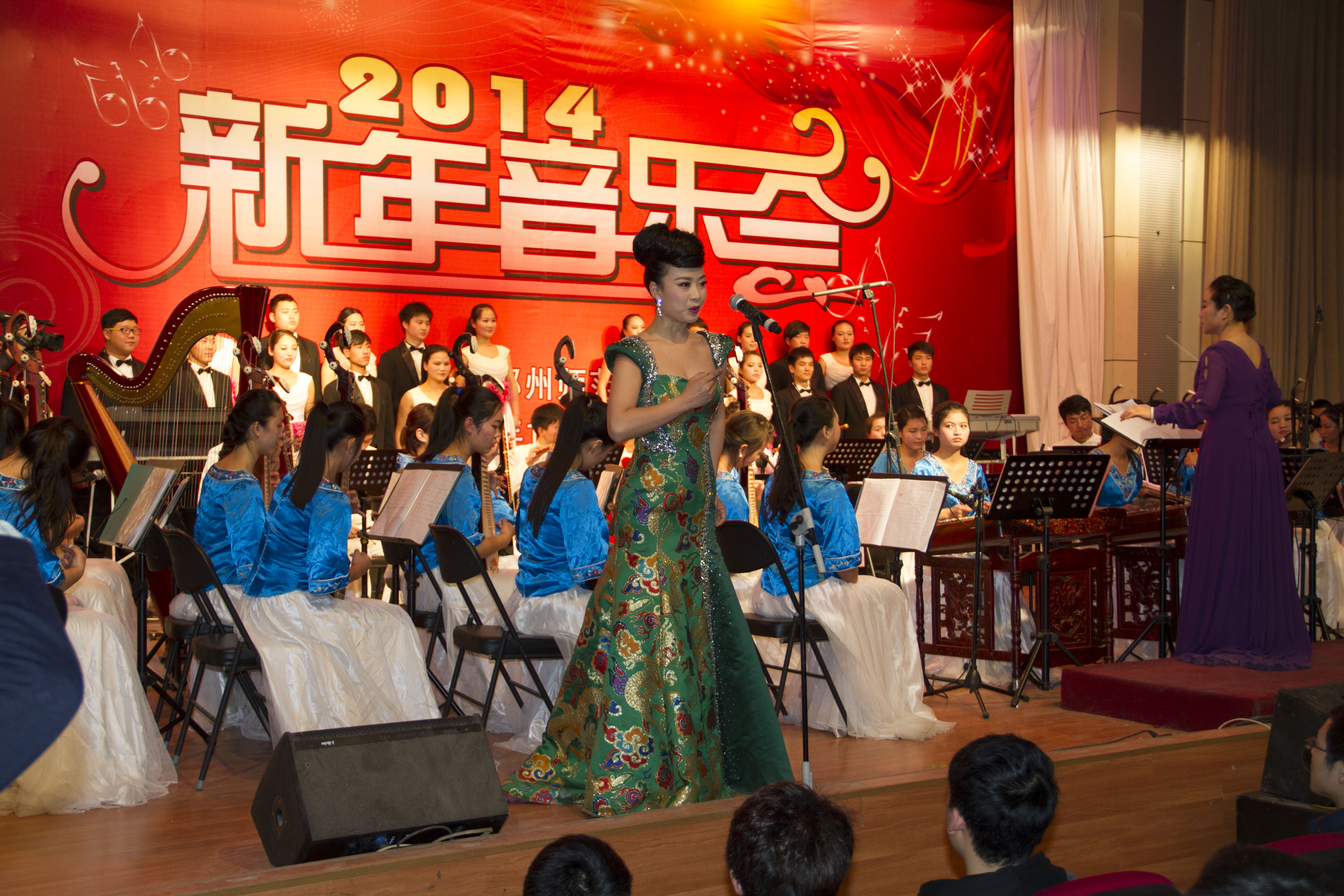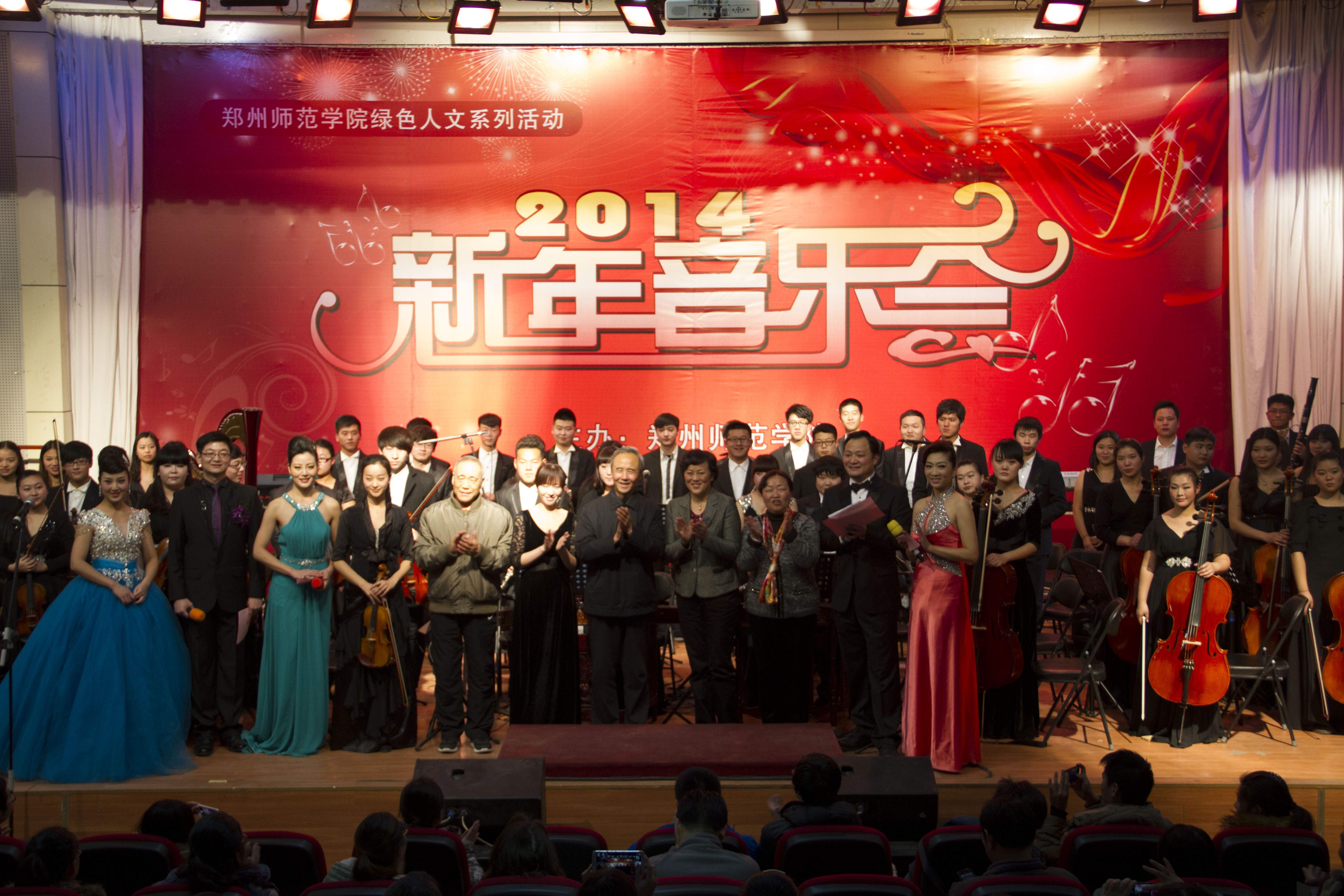 音乐会在悠扬的器乐声中拉开了帷幕。“2014年新年音乐会”的所有节目均由我校师生创作和演出,已经先后举行过声乐、交响乐、民乐、舞蹈、音诗画和综合等专场艺术形式,精彩的演出受到师生们的热烈欢迎,通过连续10年的打造,“新年音乐会”已成为我校颇具影响的年度活动品牌。我校多年来一直重视校园文化建设,举行了绿色人文系列活动,坚持请进来、走出去,以高雅艺术打造校园文化,先后迎来了中芭、中国歌舞剧院、中央歌剧院、陕西话院、省歌舞剧院等院团,也凭自身实力打造了豫剧音乐剧《大别山女儿》、歌剧《原野》、中外歌剧精选等剧目,成功跻身河南省高雅艺术进校园剧目,在省内高校巡演,成为河南省唯一一所连续五年有作品跻身此列的高校!