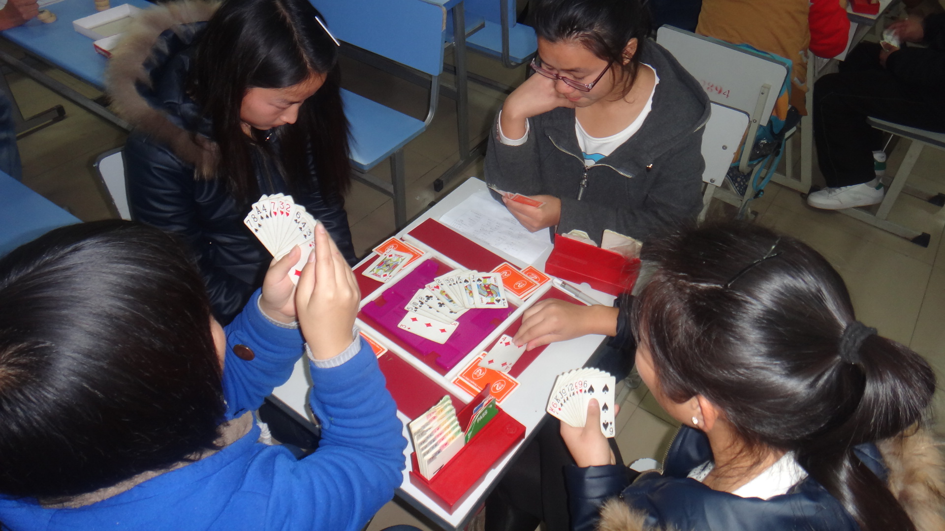 本次活动分为跳棋比赛,象棋比赛,“正式桥牌”比赛三种比赛项目。采取积分制的方法,近百名选手进行了激烈的棋盘角逐。比赛中,选手们本着“切磋棋艺,以棋会友”的原则,秉持“友谊第一,比赛第二”的精神,体现出较高的素质,表现出了良好的竞技状态。在这场没有硝烟的棋牌对弈中,选手们或托起腮膀认真思考,或皱起眉头凝视,举手投足尽显专业选手的风范。经过激烈的角逐,多名同学脱颖而出。